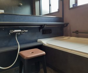 - 落ち着いた色合いでかっこよくまとまった浴室