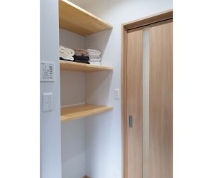 - 脱衣室にはタオルや衣類・備品が仕舞える棚を設置しました